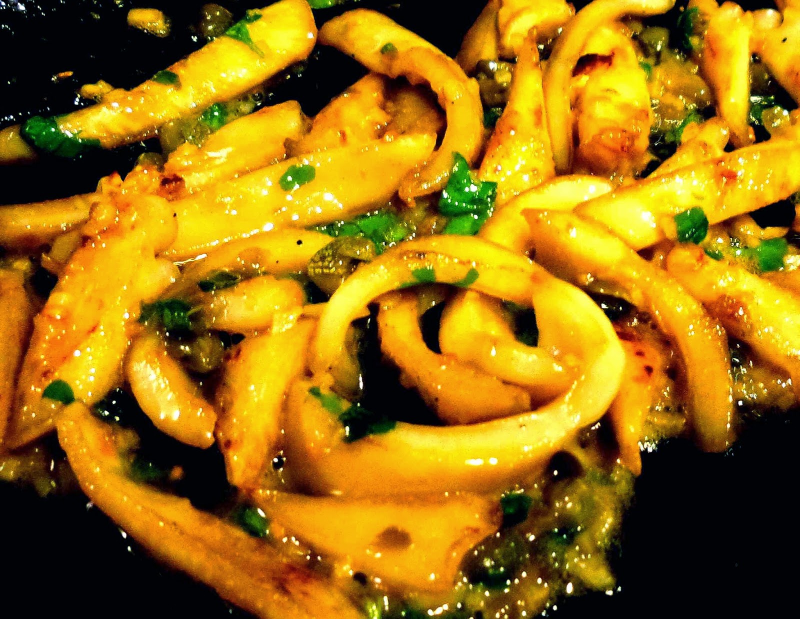 I mostly used the head in this dish, with only a couple of tentacles, as some sources recommended discarding the head etc., so I decided to try it in a quick dish to see how it was. Please note, you can only see a half quantity in the pan shots, if you think it looks small! I much preferred the texture to squid, it was meatier, and less 'bouncy' and I cannot imagine why anyone would not use this part of the octopus. Octopus has a very mild flavour, more delicate than squid, I'd say. I frequently finish pan-seared scallops in this manner, minus the capers and garlic, and we often eat them straight out of the pan, they're so delicious!